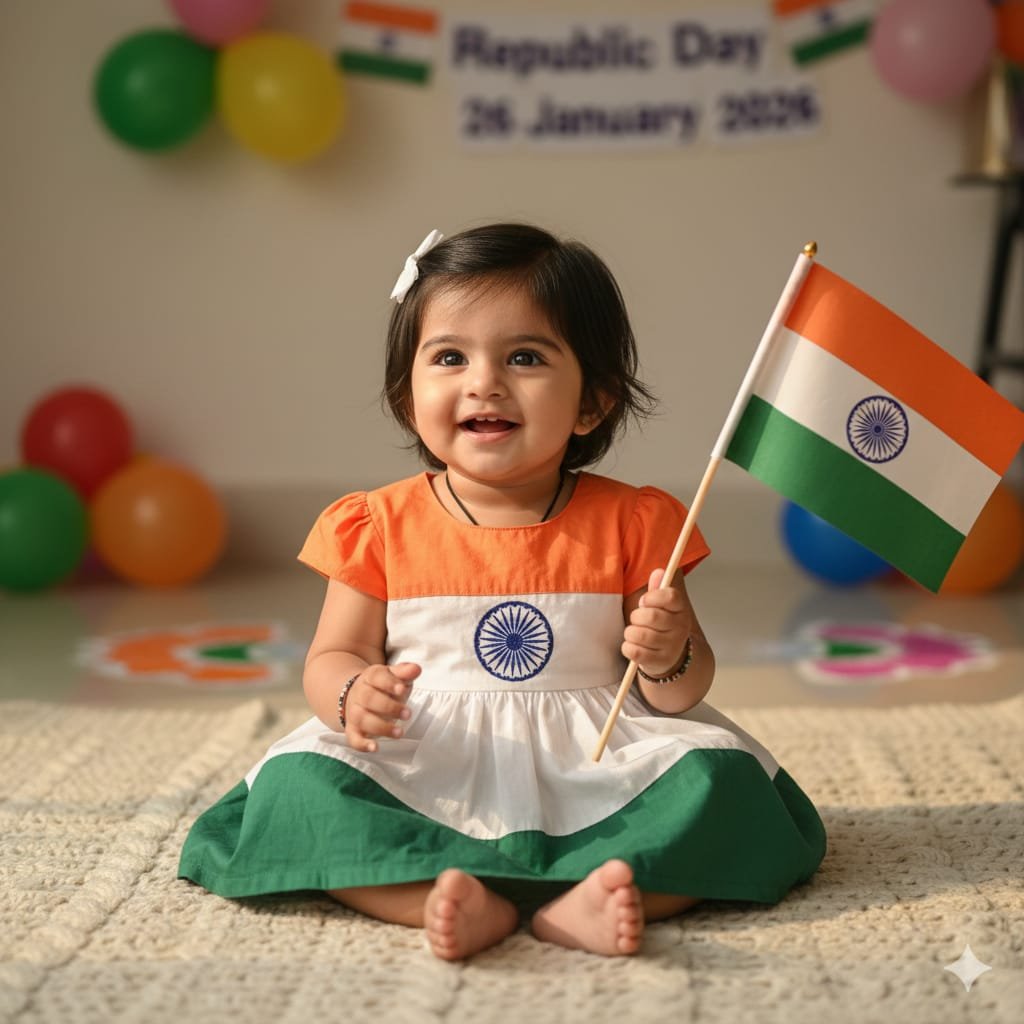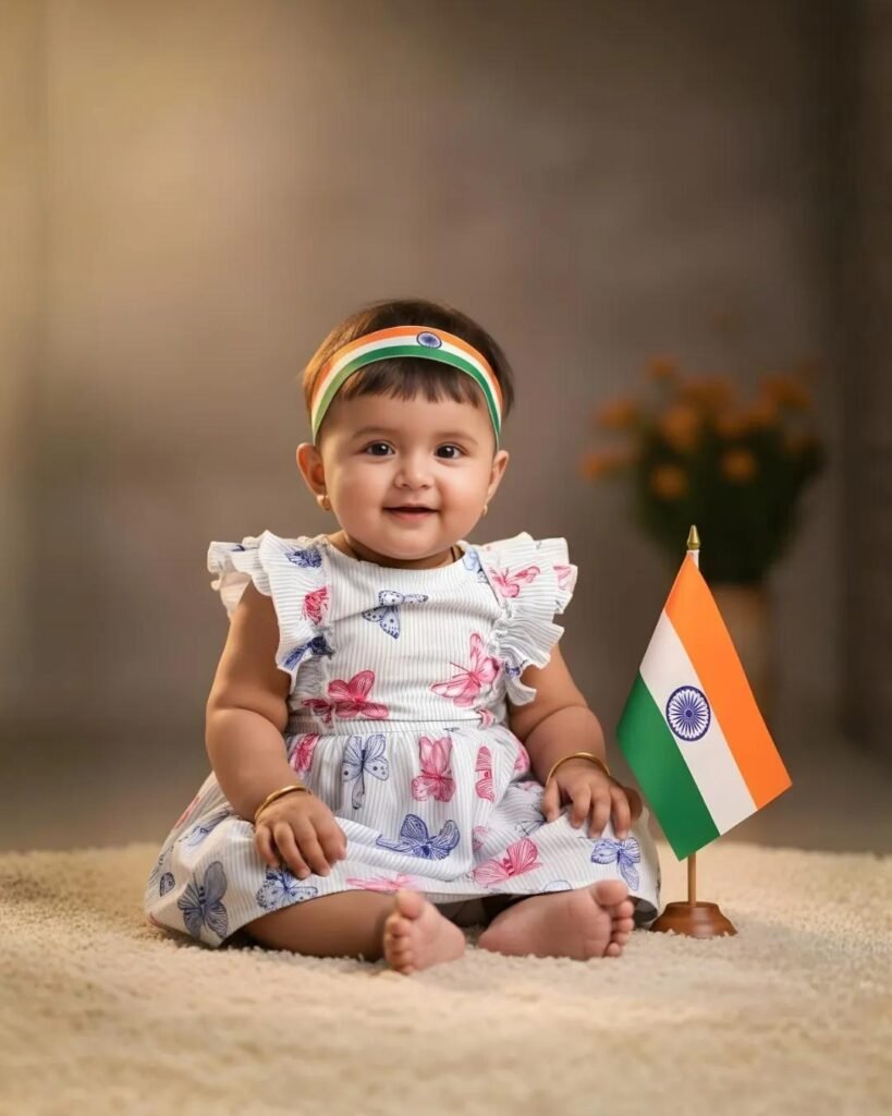 A cinematic portrait of a cute Indian baby girl with a tiny tricolor hairband, sitting calmly and looking at the camera, Indian flag placed beside her, warm lighting, shallow depth of field, patriotic and emotional Republic Day 2026 theme.