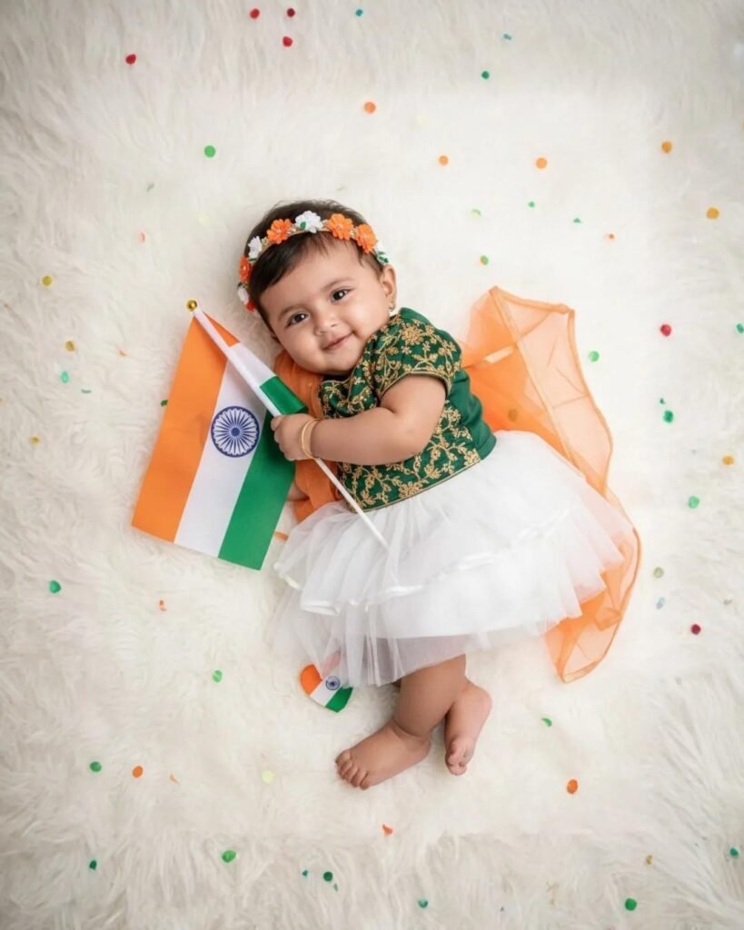 The baby is holding and hugging a small Indian national flag with clearly visible saffro white, and green stripes and a centered Ashoka Chakra. A small heart-shaped tricolour prop is placed nearby, subtle yet visible