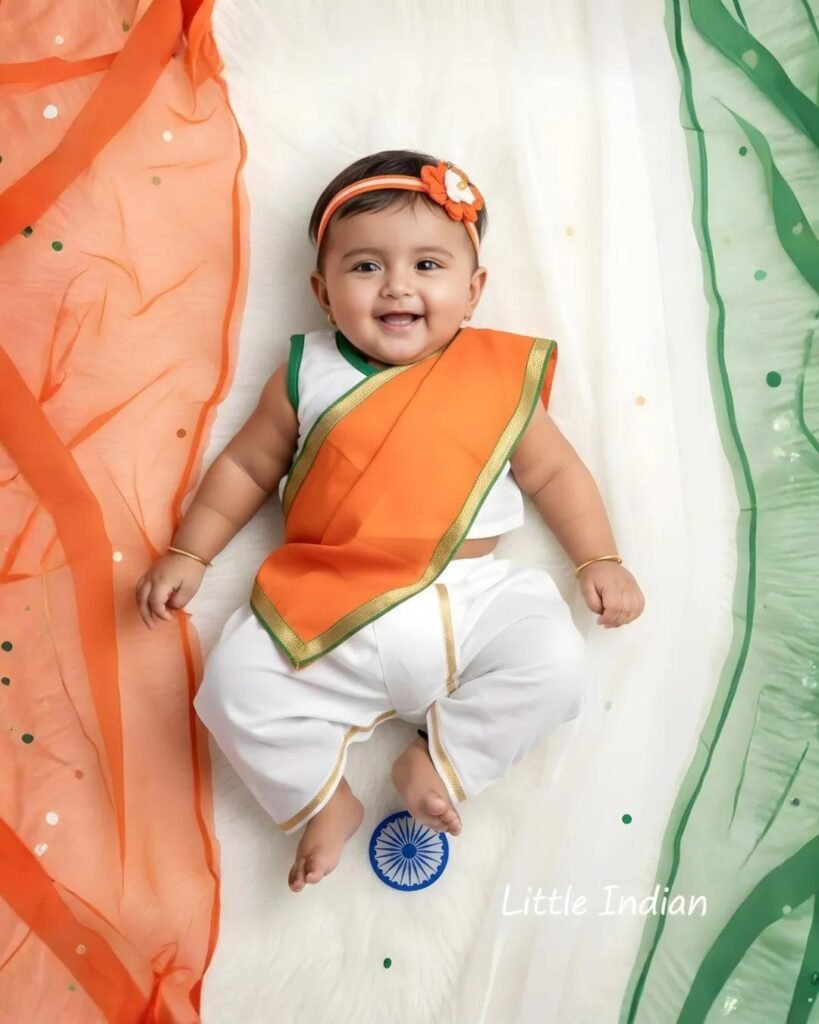Create a high-resolution, ultra-realistic Indian Republic Day baby portrait using the uploaded image strictly and only for exact facial identity preservation of the baby. The facial identity must remain perfectly unchanged, including exact face shape, cheek fullness, baby skin texture, eye size and spacing, eyebrow softness, nose structure, lip shape, smile curve, hairline, hair density, and the joyfu yful open-mouth smiling expression. Do not alter age, facial proportions, or expression in any way ay.BABY ABY STANCE / POSE (PRECISE & FIXED) The baby is positioned in a straight, centered lying- down pose, aligned vertically in the frame. The head is placed near the upper center, facing directly upward toward the camera. Both arms are naturally bent at the elbows, hands relaxed beside the torso, conveying calm happiness. The legs are gently bent and relaxed, feet close together, maintaining a soft and balanced infant posture. OUTFIT & STYLING (FULL DESCRIPTION) The baby wears a traditional Indian festive outfit styled for Republic Day. • Upper garment: saffron-orange sleeveless drape, neatly wrapped across the torso, finished with a