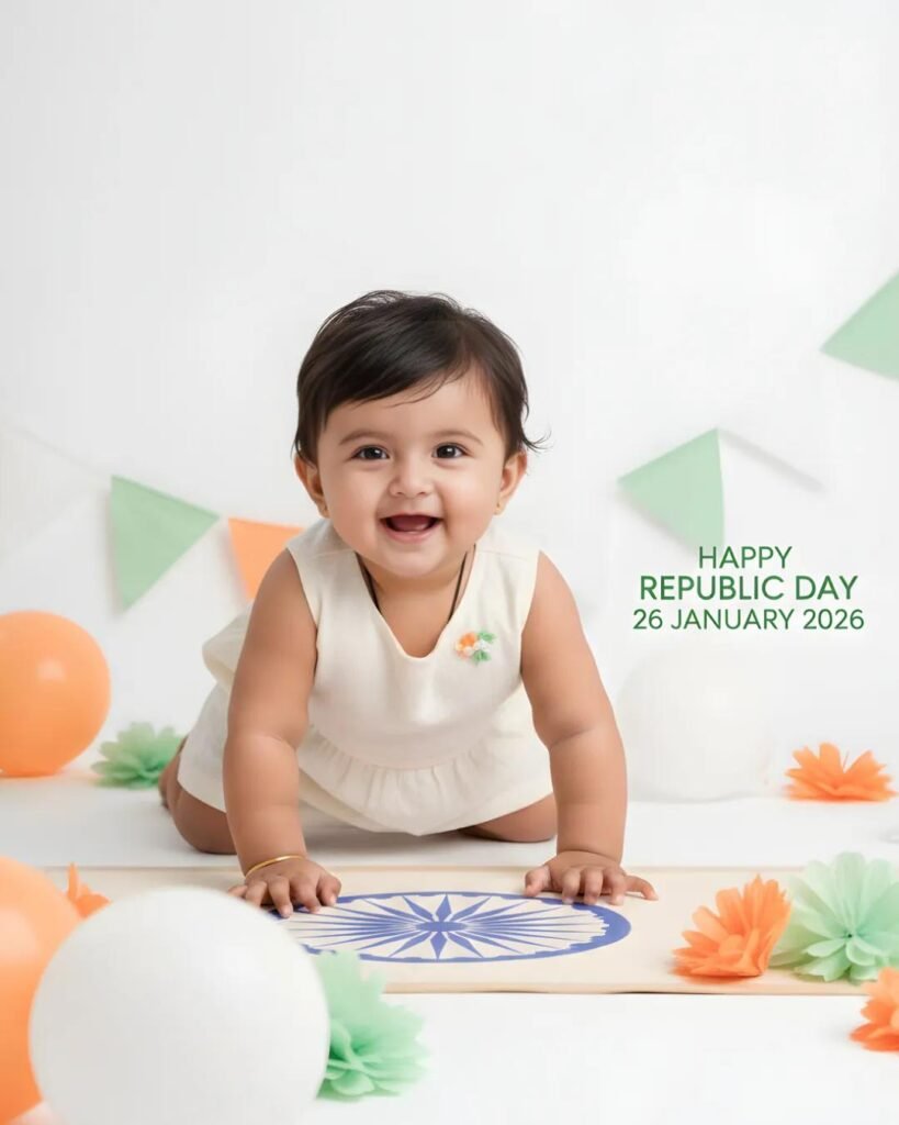 A soft pastel-style realistic image of an Indian baby girl crawling on the floor, tricolor decorations around, Ashoka Chakra subtly visible, joyful expression, minimal background, clean aesthetic, Republic Day 26 January 2026 vibe.