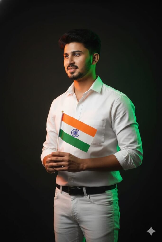 Hyper realistic 4k resolution, natural photo, ultra-detailed DSLR photography, cinematic lighting, photorealistic style. Using my reference image, keep my face exactly the same, Scene: patriotic mid-shot portrait, holding a small Indian national flag (tricolor with Ashoka Chakra), soft confident smile, 3/4 face angle looking slightly to the side, calm proud vibe.