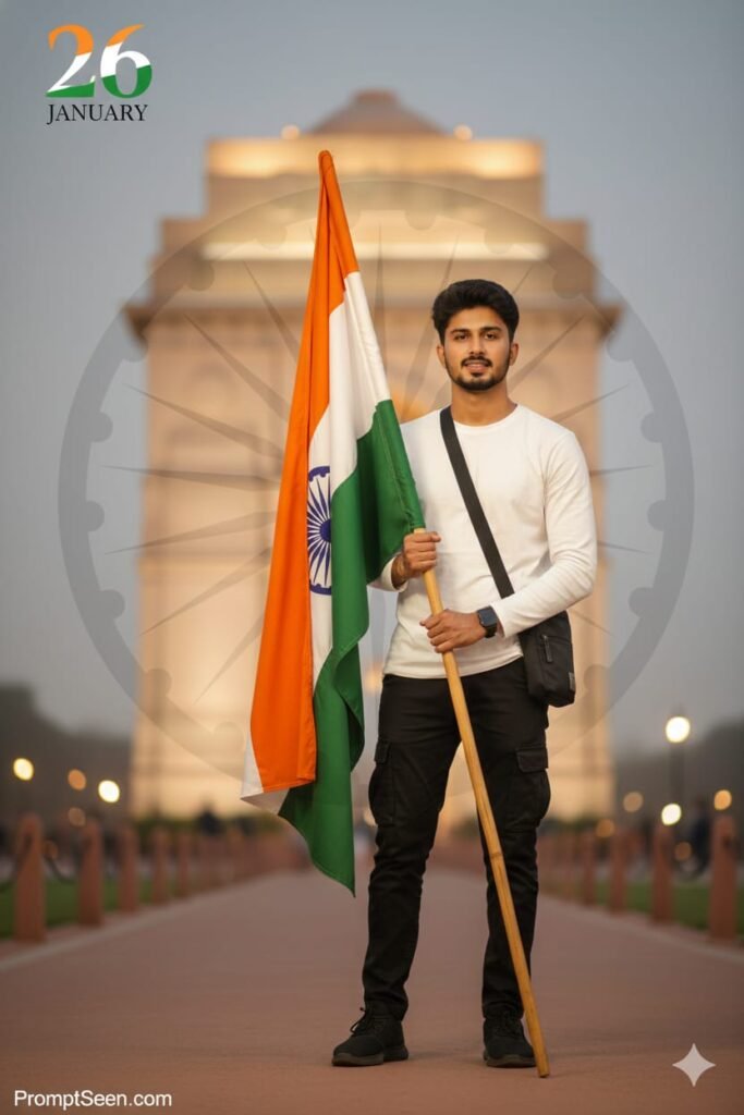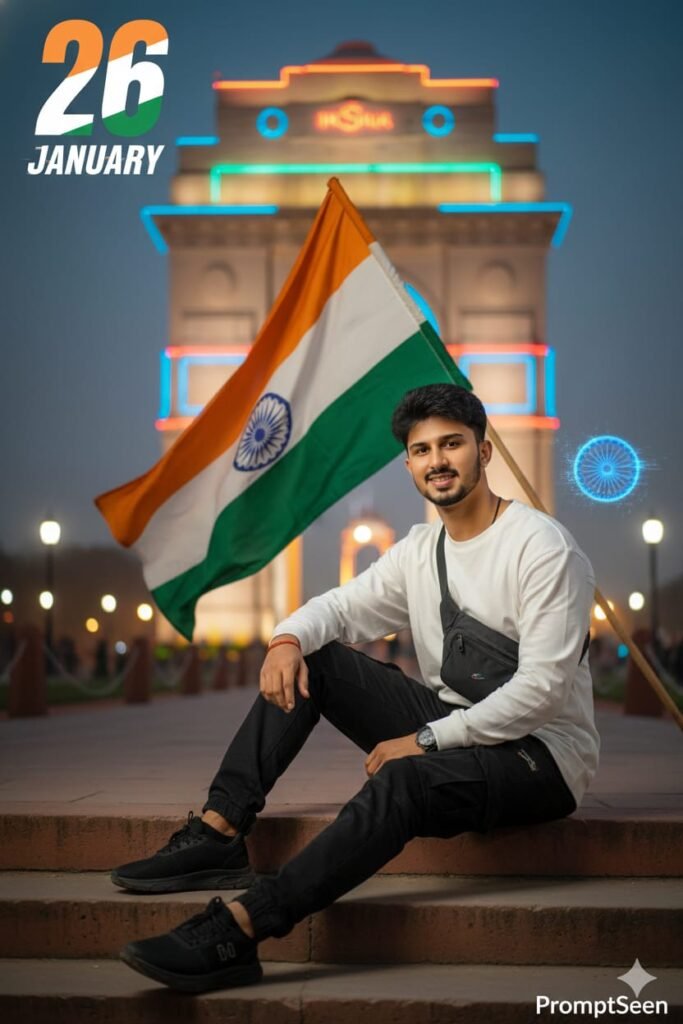 Ultra-realistic modern patriotic portrait of the uploaded Indian boy sitting casually on a concrete step, holding the Indian tricolor flag behind him flowing in the wind. White oversized long-sleeve T-shirt, black cargo pants, black sneakers, sling bag. India Gate neon-lit in the background, Ashoka Chakra as a subtle holographic overlay, cinematic dusk lighting, shallow depth of field, crisp 8K DSLR quality. Bold graphic 26 in tricolor, "JANUARY" with glitch-blur typography. Small "promptseen.com"