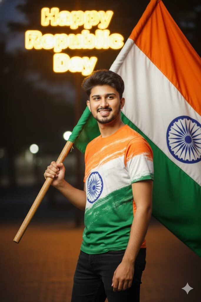 face A medium shot of a young Indian man with the exact same face, highly detailed 8K ultra-realistic image. wearing an Indian flag-printed shirt with black jeans. He is gently holding an Indian national big flag in his right hand. The scene is set outdoors,. Warm, glowing cinematic lighting. In the background, glowing text reads: " Happy Republic Day". Ultra-sharp focus, natural skin texture, realistic colors, professional photography, shallow depth of. Don't change my face. Voluminous hairstyle. Right side face