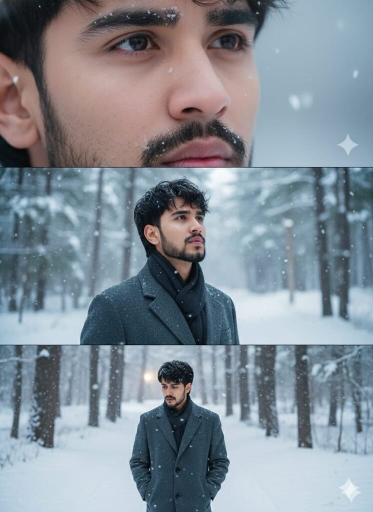 identical face shape, eyes, nose, lips, ears, and hairstyle from the uploaded man. Create a 9:16 vertical cinematic composite photo divided into 3 stacked frames showing the same man in a winter snow scene. The atmosphere is emotional, calm, slightly dramatic like a moment from a Korean romance film.Top frame (close-up macro): tight shot of her eye and cheek. Snowflakes delicately cling to both upper and lower.
