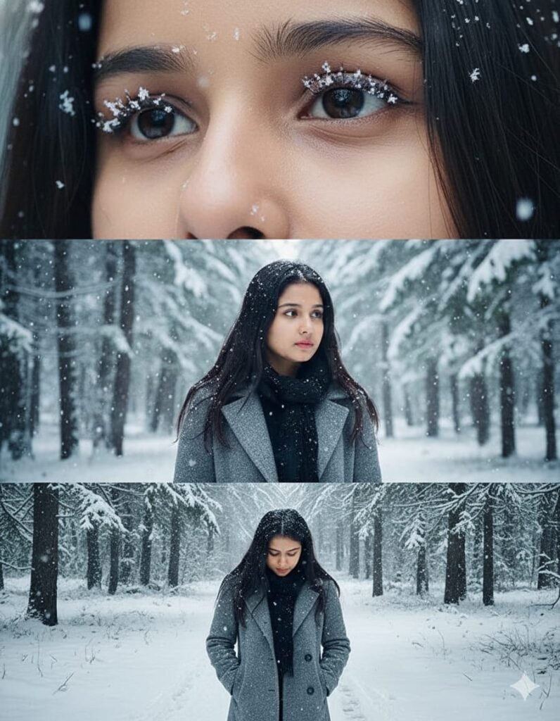 identical face shape, eyes, nose, lips, ears, and hairstyle from the uploaded woman. Create a 9:16 vertical cinematic composite photo divided into 3 stacked frames showing the same woman in a winter snow scene. The atmosphere is emotional, calm, slightly dramatic like a moment from a Korean romance film.Top frame (close-up macro): tight shot of her eye and cheek. Snowflakes delicately cling to both upper and lower.