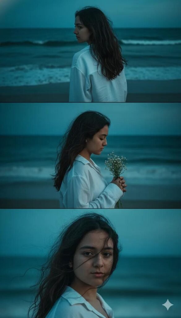 A split image showing three panels. The subject is a young, attractive woman with dark, messy hair, wearing a white button-down top on a beach at dusk. Panel 1 (Top): From behind, showing her looking out at the dark ocean. Panel 2 (Middle): Side profile, holding a small bouquet of white flowers, looking down. Panel 3 (Bottom): Close-up of her face, high detail, moody lighting, intense gaze wind-blown hair Cinematic, deep blue and teal tones dramatic lighting Unchanged face and expression