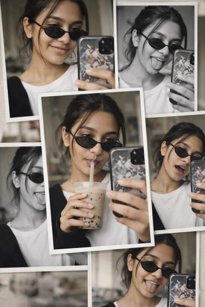 Style Keywords: Aesthetic selfie collage, candid lifestyle photography,