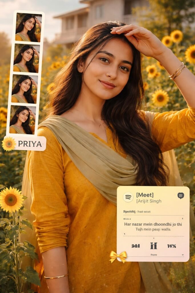 Transform my image into a 64K DSLR-quality shot resolution ultra-hyperrealistic cinematic bright outdoor lifestyle portrait of a young woman (same face as the uploaded image) standing in a blooming sunflower garden during golden hour. Vertical 4:5 Instagram-style composition with creative collage elements layered into the frame. A cheerful young woman (same face as the uploaded image) with long, wavy dark brown hair flowing naturally over her shoulders. She is smiling softly with her eyes opened, radiating warmth and serenity. One hand is lifted to her forehead as if shielding sunlight, creating a candid sun-kissed pose. Her posture is relaxed and graceful, slightly
