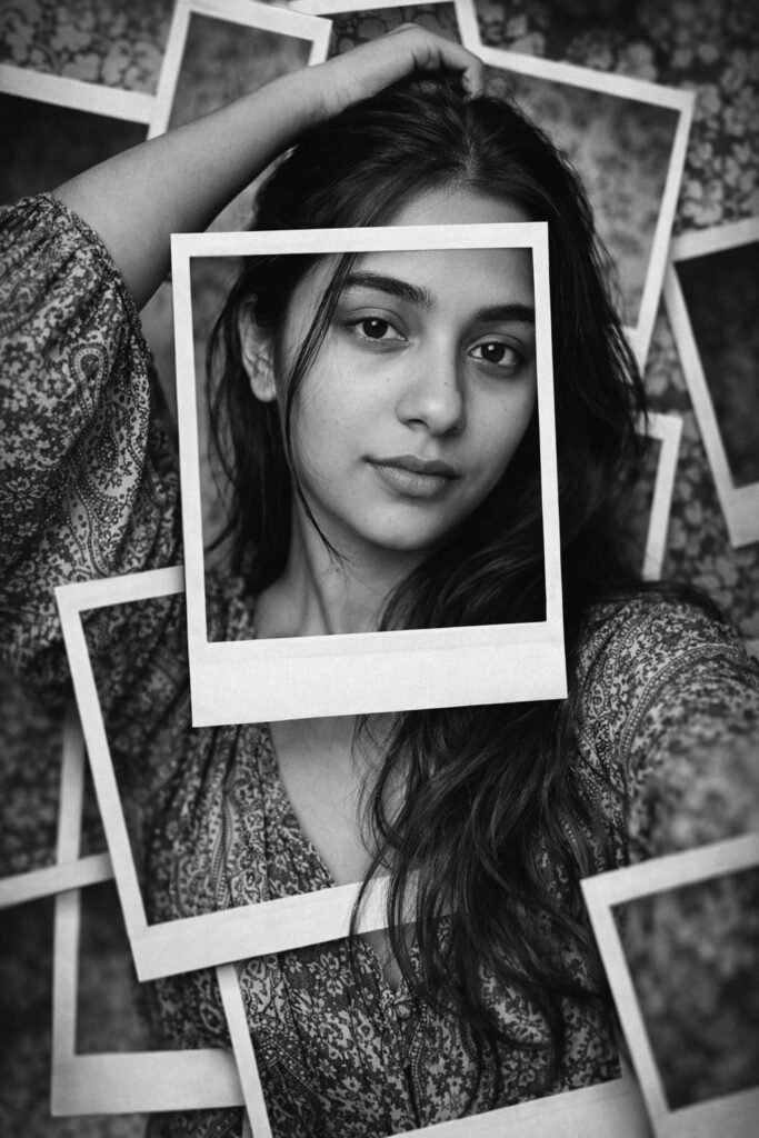 frame, slight blur on outer frames for depth. High clarity, fine grain for classic film texture. Style tags: monochrome photography, Polaroid collage art, layered composition, high detail, vintage aesthetic, editorial portrait, artistic framing, timeless black-and-white. Octane render, Ultra-hyperrealistic & Unreal Engine 5.