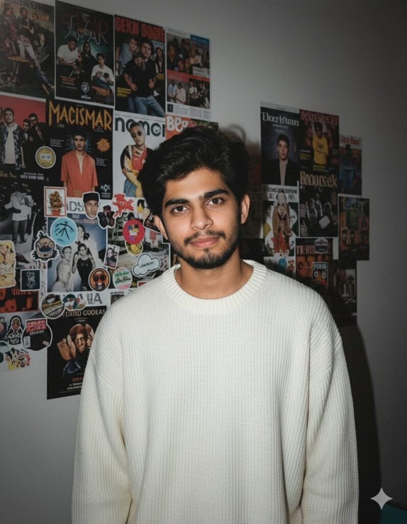 Without changing my original face, create a portrait of me captured with a 1990s-style camera using a direct front flash but not my eyes. My messy dark brown hair, posing with a calm yet playful smile like in the picture. Me wears a modern oversized black hoodie with red spider with web in centre The background is a dark white wall covered with aesthetic magazine posters and stickers, evoking a cozy bedroom or personal room atmosphere under dim lighting And my one hand is on my neck