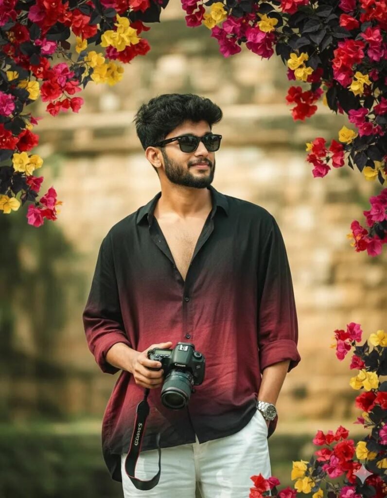 Creat a 8k hyper-realistic dark green portrait cinematic image with dramatic smile actions.(uploaded  photo 100% face match) of A stylish handsome young man (refrence image given) with a slightly dark messy hairstyle and wearing a lose black & maroon gradient half lineing shirt and white lose pant. He hold a Canon camera, He is looking thoughtfully off-camera, captured in a candid, high-key cinematic outdoor portrait The composition is framed by a branch of vivid red/pink/yellow/black
