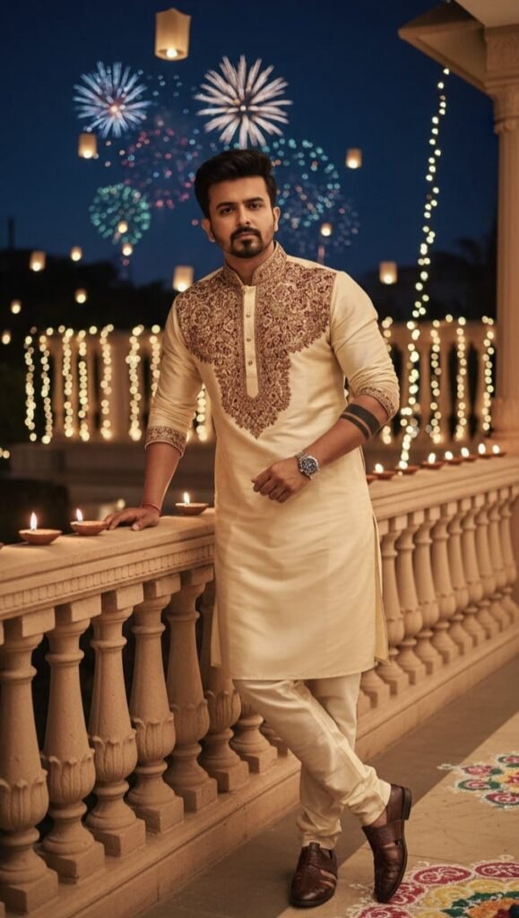 Ultra hyper-realistic, eye-level full-body vertical portrait of a handsome young man leaning casually on a terrace railing outside a bangle. One hand rests on the railing, the other hand near his pocket, relaxed cinematic vibe. Wearing luxurious embroidered designer kurta, tailored Patiala pyjama, premium leather sandals. Face and perfectly styled hairstyle exactly as in uploaded reference. Luxury wristwatch sparkles, bold armband tattoo visible. Nighttime Diwali scene with glowing diyas, floating lanterns, fairy lights, vibrant rangoli, and distant fireworks. Soft warm reflections on surroundings, shallow depth of field, creamy cinematic bokeh, rich warm film-style color grading, ultra-HD 8K, luxury fashion photoshoot aesthetic.
