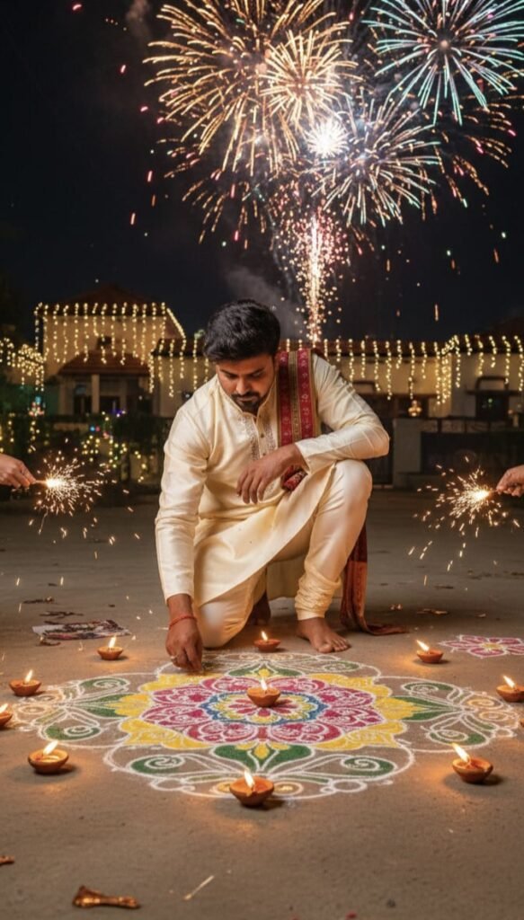 There is a man who is making a huge rangoli in front of his house in traditional. Cream kurta and pajama and at that time it is the festival of Diwali and a lot of firecrackers etc. are going off in the sky and a lot of diyas are placed around the rangoli and also on the rangoli.