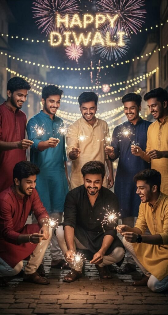 A hyper-realistic 8K cinematic festive portrait of a group of young men celebrating Diwali on a decorated street at night. The main man (same face as reference, stylish hair and trimmed beard) is crouching in the center, wearing a black kurta and white pajama, lighting a sparkler on the ground with a warm smile. Around him, six friends in colorful traditional kurtas (red, beige, blue, and yellow) laugh and hold sparklers, their faces glowing from the light. The background features golden string lights hanging across the street, with fireworks bursting in the sky above, spelling out "HAPPY DIWALI" in glowing golden Letters. The street is warmly lit, filled with bokeh lights, smoke, and festive ambiance. Realistic skin tones, ultra-detailed lighting, DSLR photo-quality depth, cinematic shadows, and joyful atmosphere.