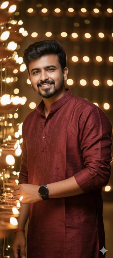 Ultra-realistic 8K DSLR festive portrait of the same young man (face must remain 100% identical to the reference without changes). He is dressed in a rich deep maroon kurta with subtle embroidered texture, wearing a round black smartwatch. Shot waist-up, one hand rests lightly on glowing fairy lights while the other stays relaxed by his side. He gives a wide confident smile, looking directly at the camera. The background is filled with soft glowing diyas (lamps), blurred fairy lights, and warm Diwali bokeh for a rich festive ambiance. Cinematic low-angle framing, natural skin tones, sharp realistic textures, professional 8K DSLR clarity.Make sure the face remains the same and 100% preserved.