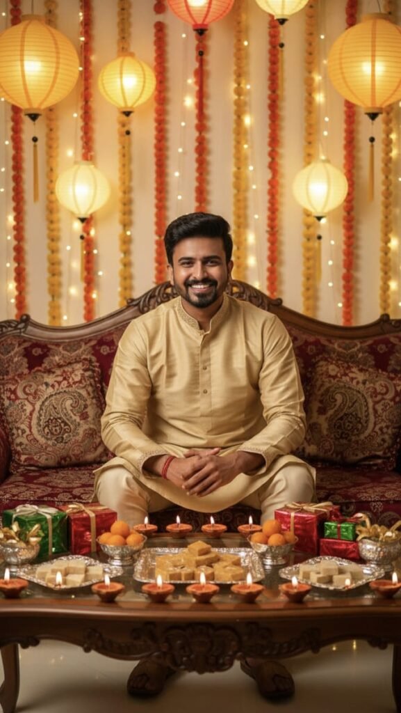 Ultra-realistic 8K DSLR indoor Diwali portrait of the same young Indian man (face and hairstyle will same). He is sitting on a festive couch, wearing a golden-beige kurta with matching churidar. In front of him is a decorated wooden table with rows of glowing diyas, wrapped gifts, ladoos, and silver trays of kaju katli. He leans slightly forward with both hands resting on his knees, smiling brightly. The background glows with paper lanterns, fairy lights, and marigold garlands, cinematic warm festive ambiance, ultra-realistic textures, professional DSLR 8K sharpness.