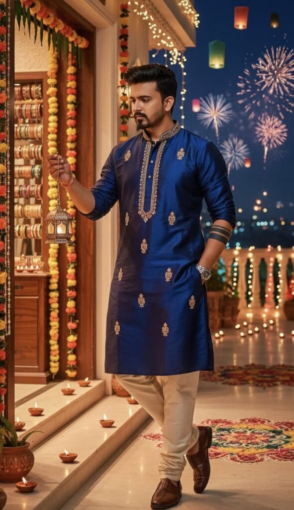 Ultra hyper-realistic, eye-level full-body vertical portrait of a handsome young man standing outdoors on a lavish terrace outside a bangle, lifting a floating Diwali lantern with one hand while the other hand rests casually near his pocket. Wearing luxurious embroidered designer kurta, tailored Patiala pyjama, premium leather sandals. Face and perfectly styled hairstyle exactly as in uploaded reference. Luxury wristwatch sparkles, bold armband tattoo visible. Nighttime Diwali scene with glowing diyas, floating lanterns, fairy lights, vibrant rangoli, and distant fireworks. Soft warm reflections on surroundings, shallow depth of field, creamy cinematic bokeh, rich warm film-style color grading, ultra-HD 8K, luxury fashion photoshoot aesthetic.