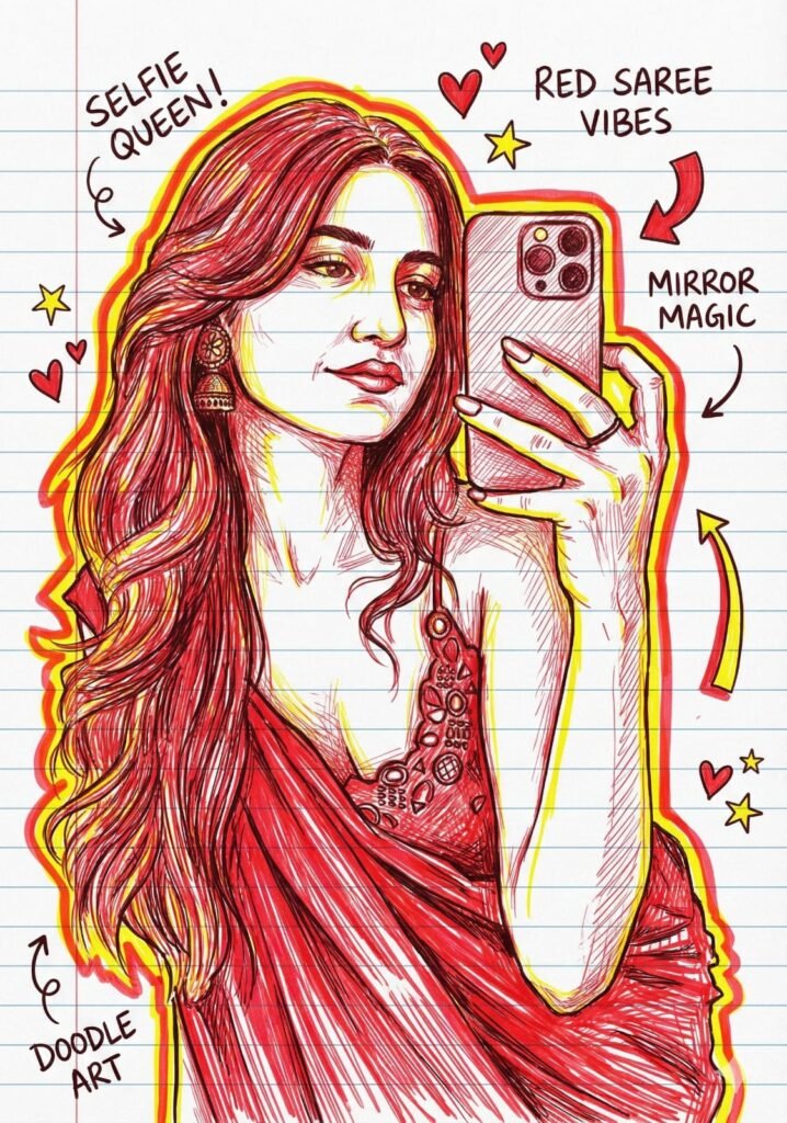 Generate a hand-drawn portrait illustration in red and yellow pen on notebook paper, inspired by doodle art and comic annotations. Keep full likeness of the subject, expressive lines, spontaneous gestures, bold outline glow, handwritten notes around, realistic pen stroke texture, 4K resolution.