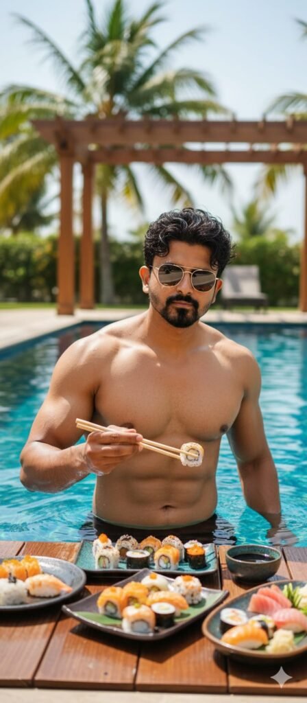 Ultra-realistic photo of [subject: use the person from reference image hairstyle will mid long curly same] keeping the same body shape, hairstyle, sunglasses, and facial features as in the reference. The person is standing in a swimming pool water halfway up the torso, shirtless and muscular. He is holding chopsticks in one hand, about to eat sushi. In front of him on the pool edge there are multiple plates of colorful sushi and a small soy sauce bowl Bright natural daylight, tropical palm trees in the background, wooder pergola structure, cinematic summer atmosphere. Shot with a full-frame amera, aper ture f/1.2, shallow depth of field, creamy bokeh background subject in sharp focus, lifestyle photography, high contrast, sharp details.