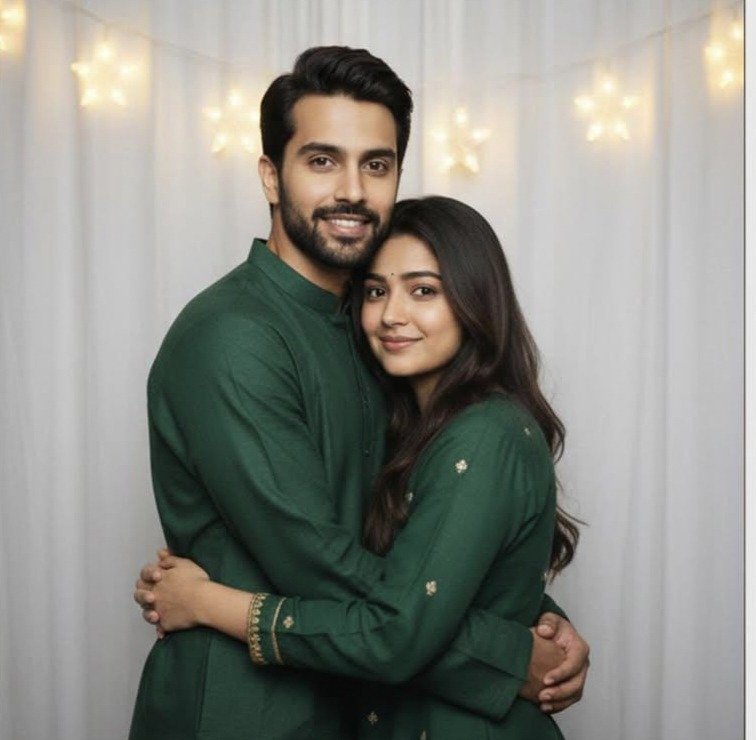 A hyper-realistic 8K cinematic DSLR double exposure portrait of a couple. Use the exact faces from the reference photo, do not alter their faces in any way. The primary close-up shows the couple forehead to forehead, eyes closed, in a soft romantic embrace. The man has a beard and wears a black patterned sherwani jacket, while the woman wears a black outfit with elegant bangles. Her hand rests on his chest, highlighting a wristwatch. The secondary exposure shows both of themstanding #couple