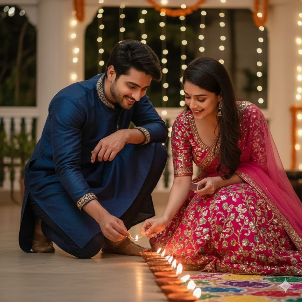 An ultra-realistic, 8K cinematic full-body portrait of a handsome young Indian man and his beautiful girlfriend. They are lovingly kneeling together, lighting a row of traditional clay diyas on a decorated verandah. The warm glow of the diyas illuminates their happy faces. The man's face is clearly visible, with a gentle smile looking at his girlfriend. She is wearing a festive lehenga. The background is blurred with bokeh from fairy lights. Shot with a Canon C70, 85mm f/1.4 lens, cinematic lighting, romantic atmosphere."