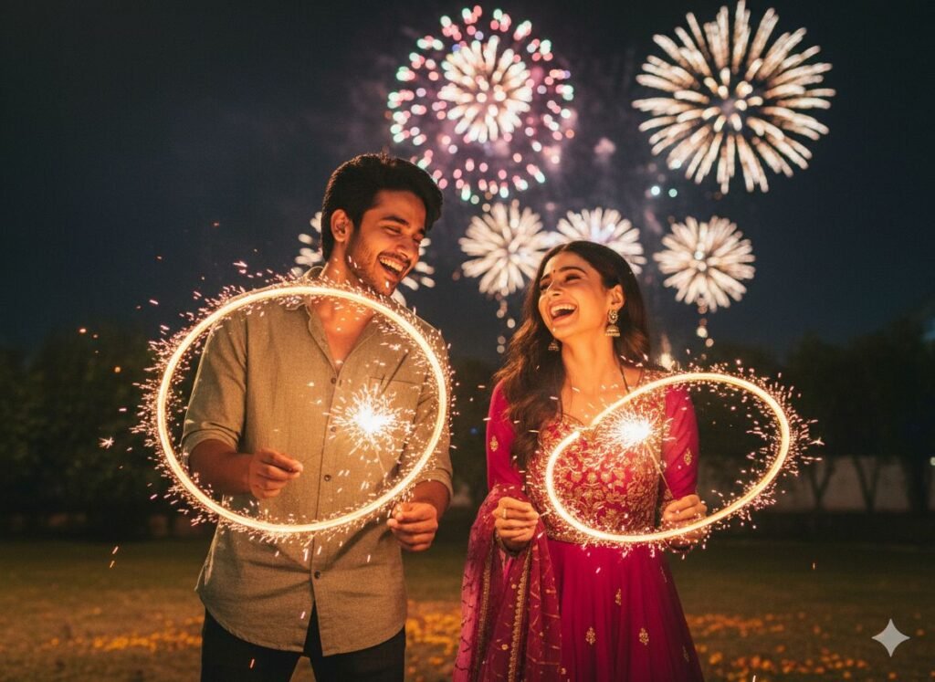 A dynamic, ultra-realistic 8K cinematic full-body portrait of a handsome young Indian man and his joyful girlfriend, both holding sparklers (fuljhadi) and laughing together. They are twirling the sparklers, creating light trails in the festive night. The man's face is full of genuine happiness, looking at his girlfriend. She is wearing a modern festive dress. Colorful fireworks are subtly visible in the distant blurred background. High-speed photography, vibrant colors, festive celebration."
