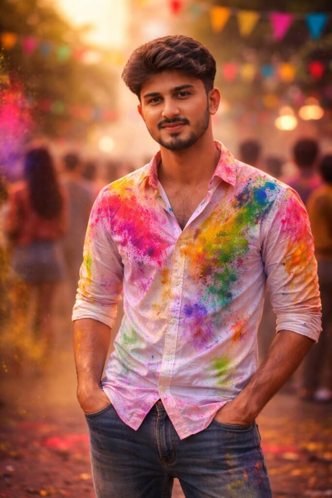 Use the uploaded male photo and uploaded female photo as the PRIMARY and ONLY face references.Both faces must match 100% exactly — same identity, facial structure, skin tone, eyes, nose, lips, hair, and expressions.Do NOT change faces. Do NOT beautify excessively.NO anime, NO cartoon, NO illustration. Faces must be fully realistic and photographic.Create a realistic Indian Holi couple photoshoot scene.A stylish young Indian couple standing together confidently.Female look:– Wearing a beautiful turquoise / blue saree with golden border– Traditional Indian jewelry (earrings, bindi, light makeup)– Holding a colorful pichkari (water gun) in hand– Natural smile, elegant poseMale look:– Wearing a black t-shirt and dark jeans– Name text like “Piyush” written on the t-shirt (customizable)– One hand in pocket, other resting casually– Confident and stylish postureHoli details:– Natural gulal colors on faces and clothes (pink, blue, yellow, green)– Color smoke in the background– Festive Indian outdoor location (garden / village lane)– People celebrating Holi softly blurred in backgroundPhotography & Quality:– DSLR camera look– Cinematic natural daylight– Ultra-realistic skin texture– Sharp focus on both faces– Soft background blur (bokeh)– High dynamic range– 4K ultra-HD resolutionMood:– Romantic– Festive– Stylish– Joyful Holi celebrationFinal image must look like a REAL professional photoshoot, not AI generated.