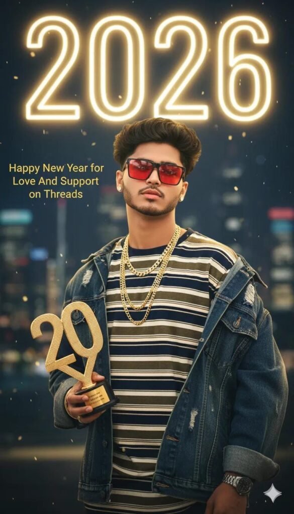 Create a hyper-realistic, ultra-detailed 100% same photo hair,and is wearing a vintage horizontal striped oversized full-sleeve shirt,layered gold Cuban chain necklaces, and a single small diamond earring.His red sunglasses .8k ultra HD of aman with your reference face standing in a Mordern denim jacket red a golden "2026" Threads trophy. Behind him, giant glowing "2026" numbers, golden follower -gold text: "Happy New Year" for the Love And Support on ThreadsJust Tap on Prompt to copy full Prompt ⤵️