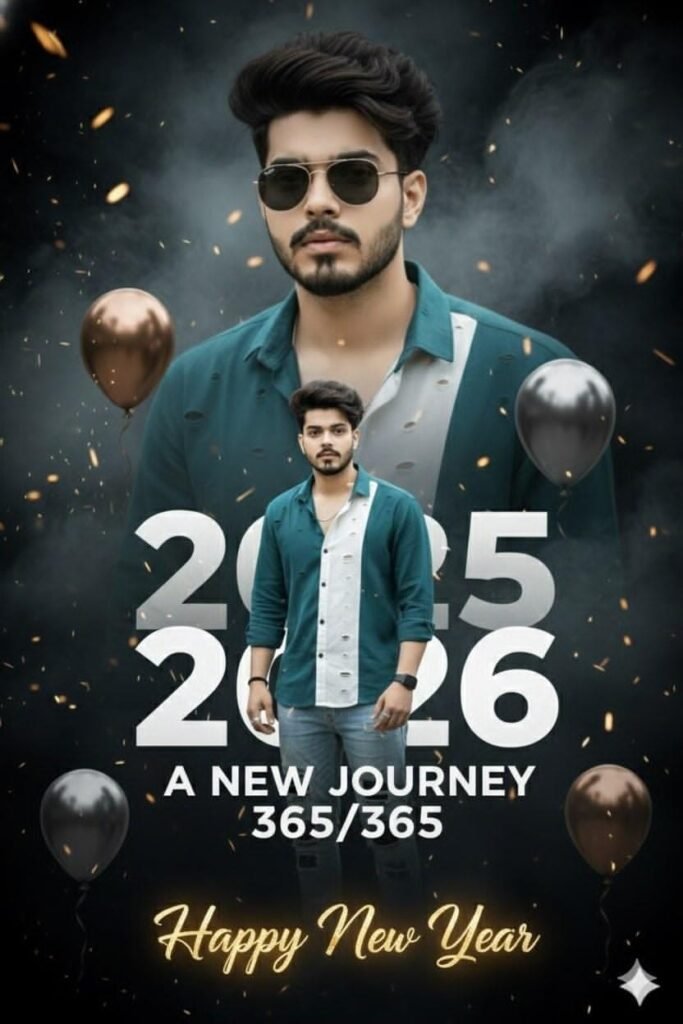 A stylish, cinematic New Year's greeting photo manipulation., cool-looking man with trendy hair (mullet-style) and sunglasses, wearing a teal/dusty green open button-down shirt. The composition is double-exposure style: a large, dominant portrait of the man in the background, with a smaller, full-body version of him layered in the foreground. Dominant text in a modern, bold font reads "2025" fading into "2026" with the subtitle "A NEW JOURNEY" and "365/365".New Year 2026 Prompt For Girls