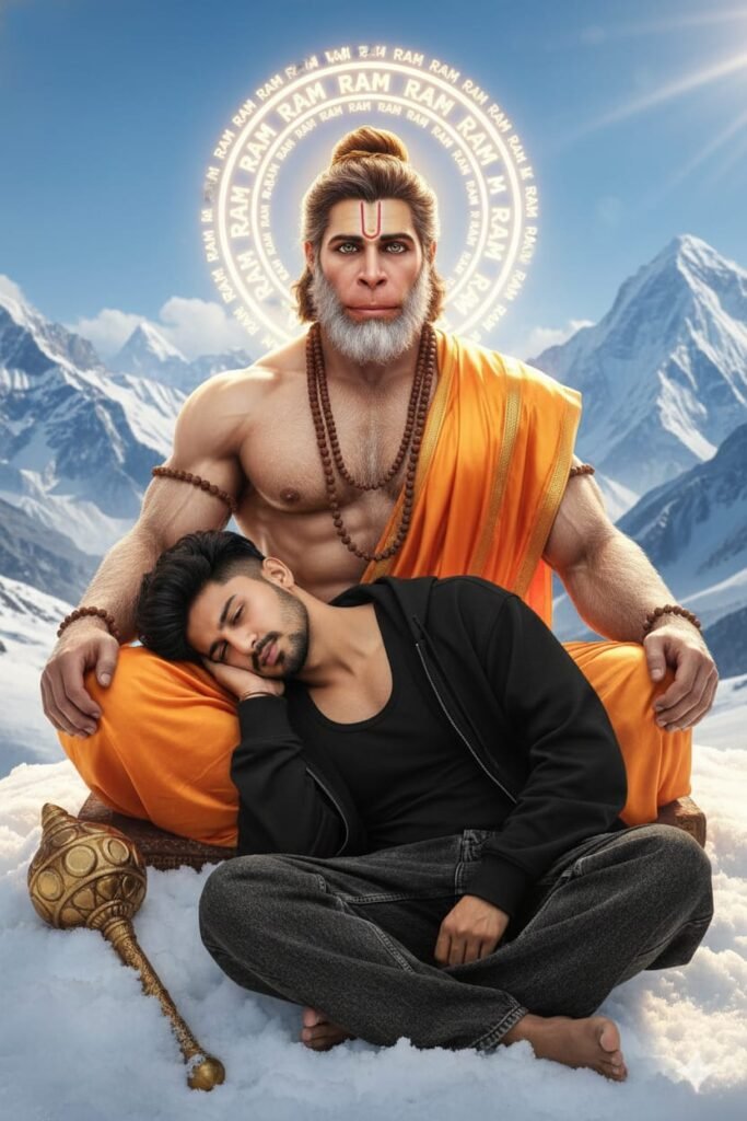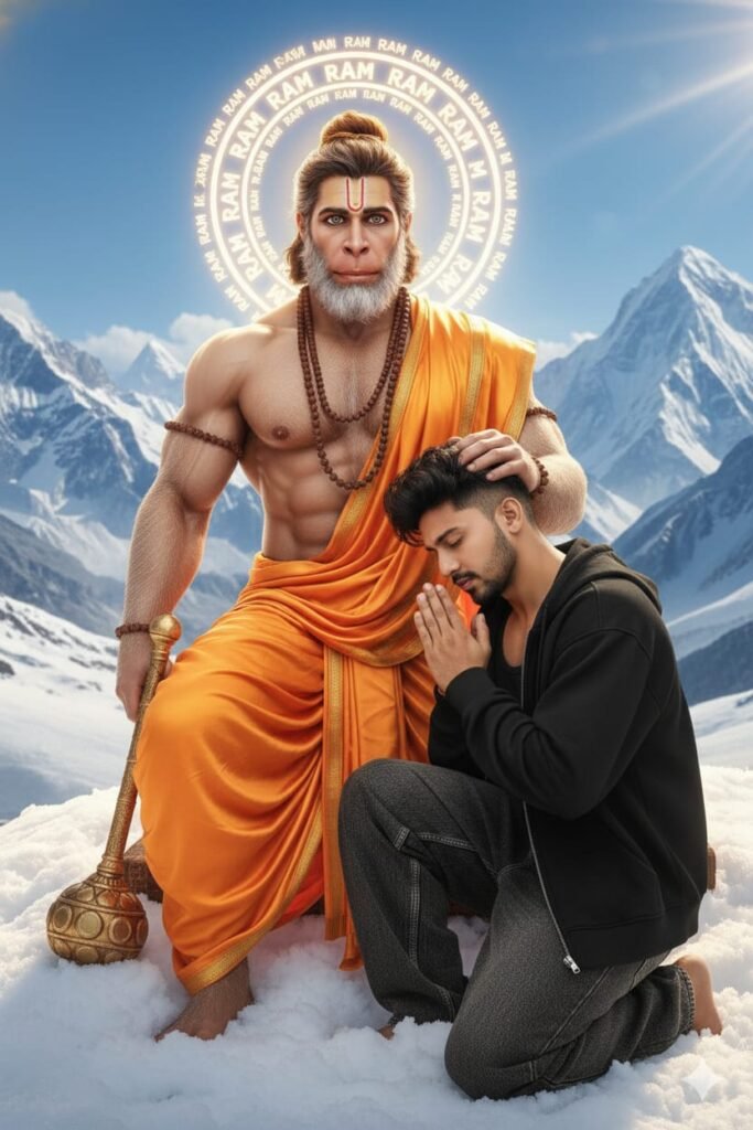"A HYPER-REALISTIC, CINEMATIC 3D RENDER OF LORD HANUMAN STANDING ON THE THICK WHITE SNOW IN THE HIMALAYAS. HE HAS A POWERFUL, MUSCULAR PHYSIQUE, A SERENE EXPRESSION WITH OPEN EYES, AND A SHORT WHITE BEARD. HE IS WEARING A VIBRANT SAFFRON-COLORED SILK ROBE AND RUDRAKSHA BEAD NECKLACES. BEHIND HIS HEAD IS S A GLOWING, DIVINE HALO MADE OF CONCENTRIC CIRCLES OF THE GOLDEN SANSKRIT WORD 'RTH" (RAM). BESIDE HIM. HE HOLDS A LARGE, ORNATE GOLDEN GADA (MACE) IN ONE HAND AND PLACES HIS OTHER HAND ON YOUNG MAN HEAD. A YOUNG INDIAN MAN WITH VOLUMINOUS, MESSY DARK WAVY HAIR AND A CLEAN TAPER FADE ON THE SIDES IN A BLACK OVERSIZED ZIP-ZAPPED HOODIE OVER A BLACK GANJI AND EXTREMELY BAGGY, WIDE-LEG DENIM JEANS IN A FADED CHARCOAL BLACK WASH. THE JEANS HAVE A VINTAGE TEXTURE WITH BAREFOOT, IS KNEELING IN A POSE OF DEEP DEVOTION (BHAKTI), WITH HIS HANDS FOLDED IN PRAYER. THE BACKGROUND FEATURES MAJESTIC, SHARP SNOW-CAPPED MOUNTAIN PEAKS UNDER A CLEAR BLUE SKY WITH A BRIGHT SUN FLARE. HIGH-END PHOTOGRAPHY STYLE, 8K RESOLUTION, INCREDIBLY DETAILED NATURAL