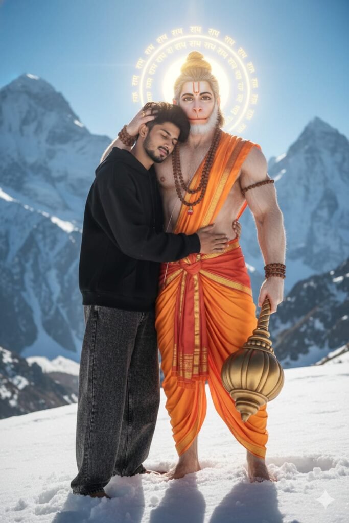"A HYPER-REALISTIC, SOULFUL OF LORD HANUMAN AND YOUNG MAN SHARING A WARM, EMOTIONAL EMBRACEAND AND STANDING ON THE THICK WHITE SNOW IN THE HIMALAYAS. HE HAS A POWERFUL, MUSCULAR PHYSIQUE, A PEACEFUL EXPRESSION WITH OPEN EYES, AND A SHORT WHITE BEARD. HE IS WEARING A VIBRANT SAFFRON-COLORED SILK ROBE AND RUDRAKSHA BEAD NECKLACES. BEHIND HIS HEAD IS A GLOWING, DIVINE HALO MADE OF CONCENTRIC CIRCLES OF THE GOLDEN SANSKRIT WORD "TH" (RAM). BESIDE HIM. HE HOLDS A LARGE, ORNATE GOLDEN GADA (MACE) IN ONE HAND AND PLACES HIS OTHER HAND ON YOUNG MAN HEAD. A YOUNG INDIAN MAN WITH VOLUMINOUS, MESSY DARK WAVY HAIR AND A CLEAN TAPER FADE ON THE SIDES AND THE BACK OF THE HAIR IS LONG AND FLOWS DOWN TO THE NAPE OF THE NECK, IN A BLACK OVERSIZED ZIP-ZAPPED HOODIE OVER A BLACK GANJI AND EXTREMELY BAGGY, WIDE-LEG DENIM JEANS IN A FADED CHARCOAL BLACK WASH. THE JEANS HAVE A VINTAGE TEXTURE WITH BAREFOOT. THE ATMOSPHERE IS FILLED WITH DIVINE LOVE, DEVOTEE OF HANUMAN, AND DEEP DEVOTION. THE BACKGROUND FEATURES MAJESTIC, SHARP SNOW-CAPPED MOUNTAIN PEAKS UNDER A CLEAR BLUE SKY WITH A BRIGHT SUN FLARE. HIGH-END PHOTOGRAPHY STYLE, 8K RESOLUTION, INCREDIBLY DETAILED NATURAL SKIN TEXTURES,