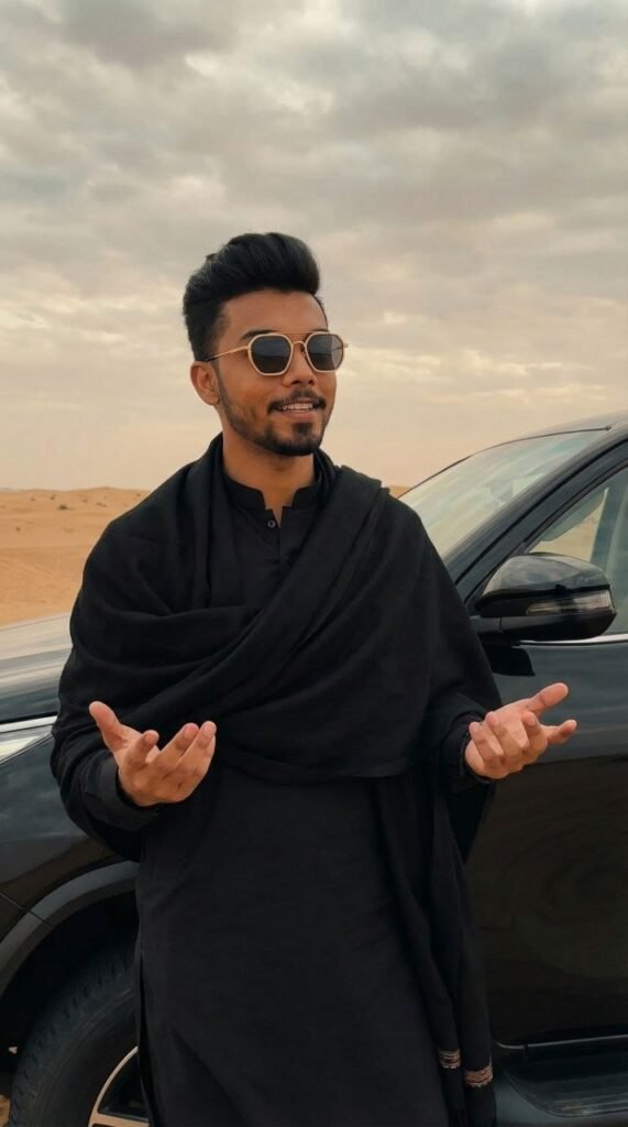 A man with medium skin tone, dark, neatly styled hair, wearing black sunglasses with gold frames, dressed in a black traditional kurta with a high collar, and a black shawl draped over his shoulders. He is standing outdoors in a desert landscape with a cloudy sky in the background, next to a black vehicle. His expression is confident and relaxed, with a slight smile, and his hands are raised with palms facing upward as if gesturing or explaining something. The scene has a warm, muted color palette with a focus on the man's stylish appearance.."
