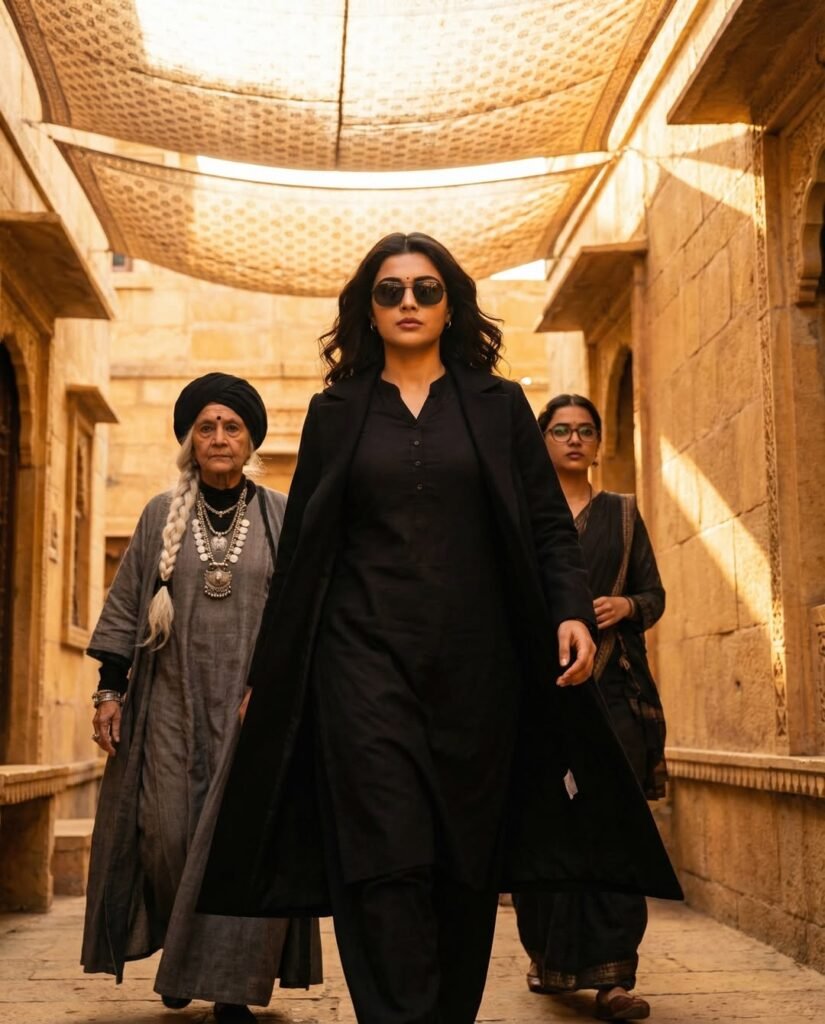 Ultra realistic, cinematic full-body portrait of the same young woman from the reference photo (same hairstyle, defined eyebrows, neatly trimmed facial contours, and confident expression). A powerful cinematic scene showing a stylish female villain making an intense entrance. A sharp-featured woman wearing a black kurta-style outfit, black overcoat, and dark sunglasses walks forward with confidence. Warm golden sunlight filters through patterned fabric shades hanging overhead, creating dramatic light and shadow on her face. Behind her, two women follow - one elderly with a long white braided hairstyle, black turban, layered grey robe, and heavy jewelru; the other younger with a confident look, dark glasses, and dark traditional clothing. The environment resembles an ancient marketplace or desert fort made of sandstone. with textured walls and warm golden tones. The camera anale is sliahtlu low, capturina a heroic, slow-motion walk. Highly detailed faces, crisp shadows, cinematic depth of field, rich colour grading, dramatic."