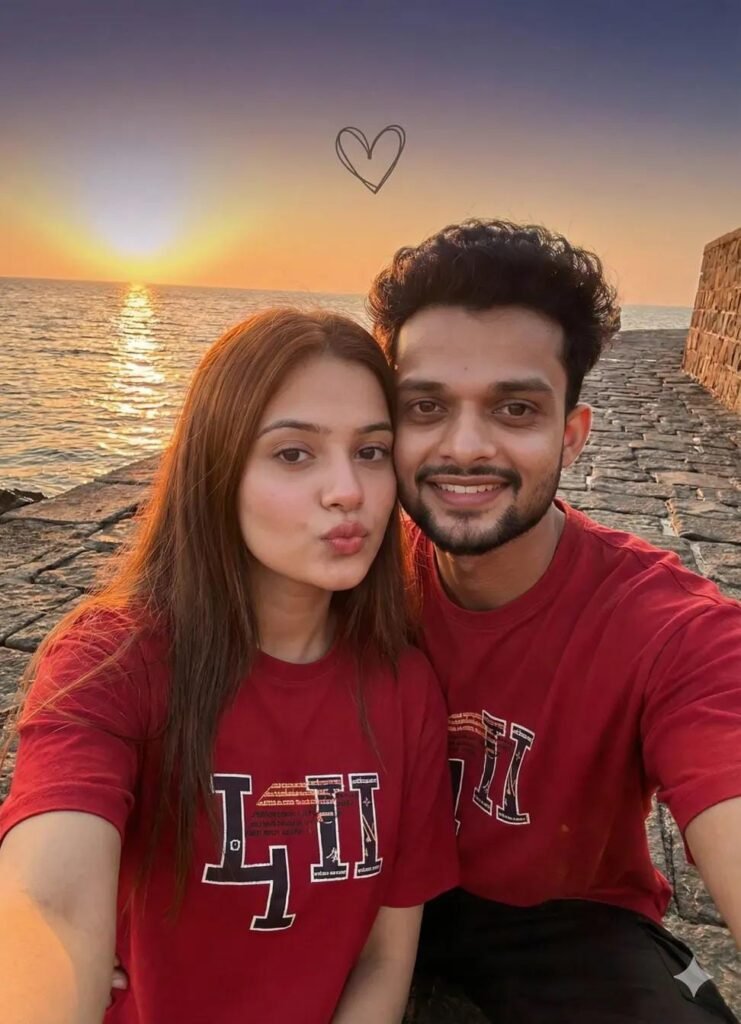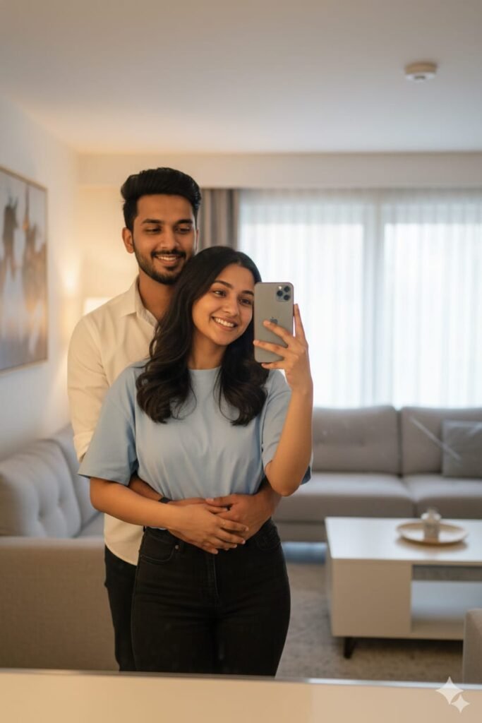 A realistic mirror selfie of a young couple. The couple on side by side, A handsome South Asian man (face use refrence image) in a crisp white shirt standing behind a beautiful girl in a light blue t-shirt and black jeans. They are posing affectionately in a modern living room with warm lighting. High quality, cinematic look, 8k resolution." Camara angle: the girl, she is very beautiful, and stylisl hairstyle, stylisl posses, very close-up shot,