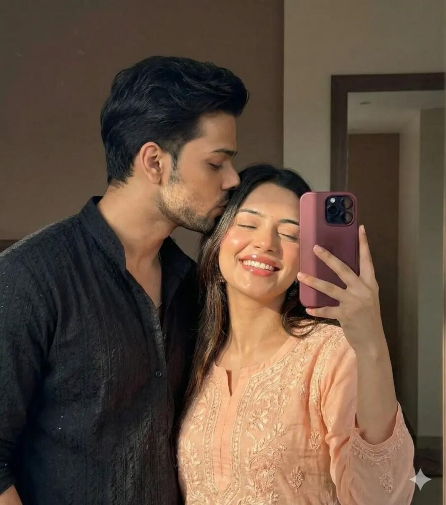 A romantic Indian couple, (use refrence image) Ultra -realistic a selfie portrait of couples in front of plain or softly-lit background. Hold your phone in one hand so it's visible in the mirror, showing your wristwatch or bracelet clearly man is wearing a white loose shirt And woman is wearing a pink loose shirt, and make sure your face is partially covered by your hair for a casually stylish look.boy one hand holding girl back. Keep 100 percent