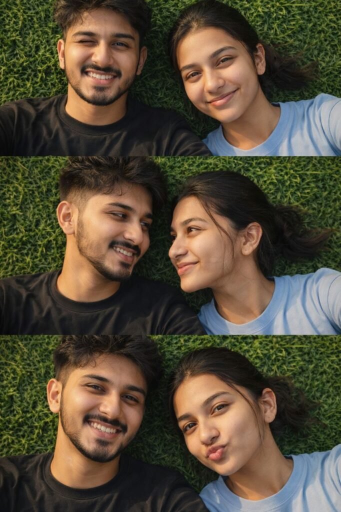 Ultra-realistic selfie photo of a couple with faces 100% identical to the uploaded reference photo, lying side by side on fresh green grass, captured from a top-down camera angle (shot from above). The boy has clear complexion, while keeping his facial identity unchanged. The girl facial remains unchanged. Face shape, eyes, nose, and smiles of both subjects must closely match the reference photo. Cheerful and natural facial expressions, created in 3 consecutive frames: