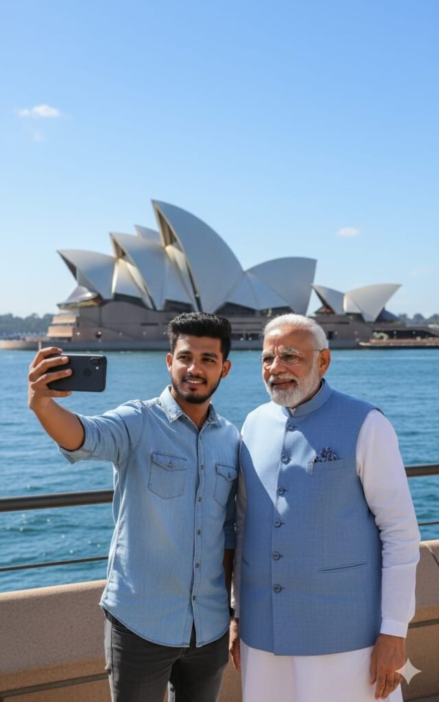 Make this photo a selfie with Narendra Modi in Sydney near Opera House. I am in casual outfit and Modi ji is in kurta pajama with jacket. The Opera House sails are visible behind with blue sky and harbor water. Bright daylight, ultra-realistic, natural selfie clarity.