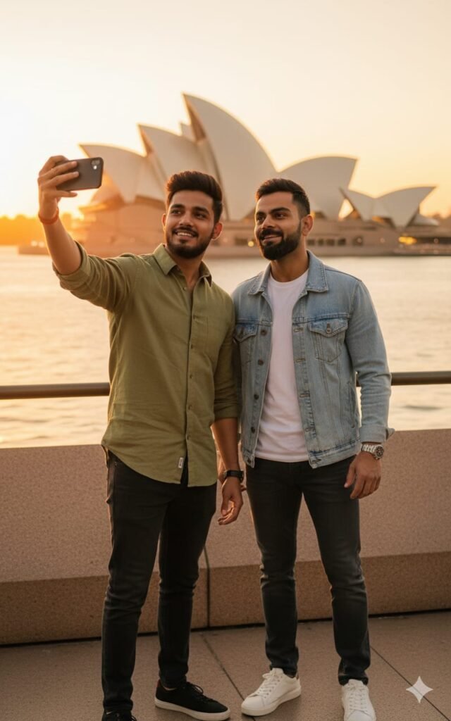 Ultra-realistic selfie with Virat Kohli in Sydney near the Opera House during golden hour. A person is holding the phone, taking a stylish selfie with Virat sir beside him, both posing confidently in trendy outfits. The Opera House sails glow with golden-orange sunlight, with warm cinematic lighting enhancing facial details. Vibrant colors, sharp clarity, and a polished, professional selfie look."
