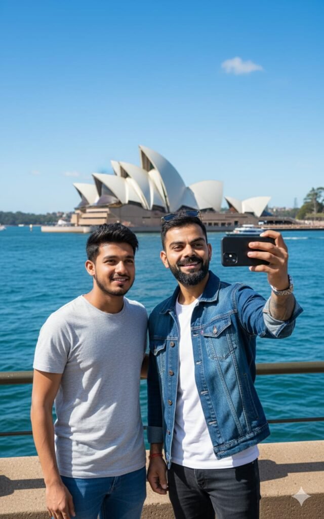"Ultra-realistic selfie with Virat Kohli in Sydney near the Opera House. A person is holding the phone and taking the selfie with Virat sir standing close beside him. Virat Kohli is in a stylish casual outfit, smiling naturally at the camera. The Sydney Opera House sails and blue harbor water are clearly visible in the background under bright daylight. Natural selfie clarity, sharp facial details, realistic skin tones, and vibrant colors. Looks like a genuine fan selfie captured on a modern smartphone