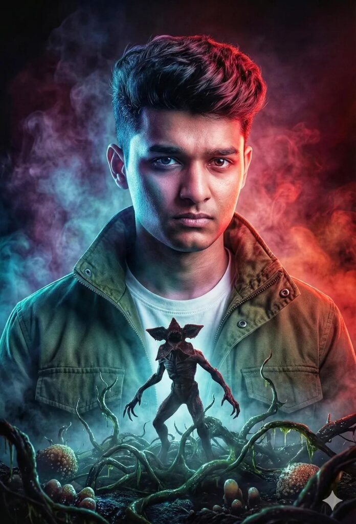 A close-up, cinematic portrait of a young man(same facial structure as image), 20s, with a modern haircut (short on sides, longer on top, styled back). He has a serious, intense expression, looking directly forward. His face is strongly lit with a split lighting effect: a cool blue light on the left side of his face and a warm red light on the right side. He is wearing an unzipped, dark olive green military-style jacket over a plain white crew-neck t-shirt. Below him, in the foreground, is a highly detailed, small Demogorgon creature standing amidst a dark, organic, otherworldly landscape of twisted, slimy black vines, alien plant pods, and dark soil. The background is a smoky, ethereal blend of blue and red mist, creating a deep, atmospheric glow around the subject. The overall aesthetic is dark fantasy, sci-fi horror, and a professional movie poster quality, with dramatic shadows and highlights."