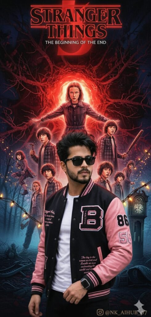 Generate an official Stranger Things season poster in the exact style of Netflix’s promotional key art, using the person in the reference photo as the central protagonist. Strictly respect every visual detail from the reference: face, hair, expression, lighting, clothing, and pose must be identical. Place the other main characters (Eleven, Mike, Dustin, Lucas, Max, etc.) in the background in their classic poster poses. Include the iconic red Stranger Things logo typography, fog, Christmas lights, grandfather clock, Upside Down gate, and full retro 80s aesthetic exactly like the real posters.