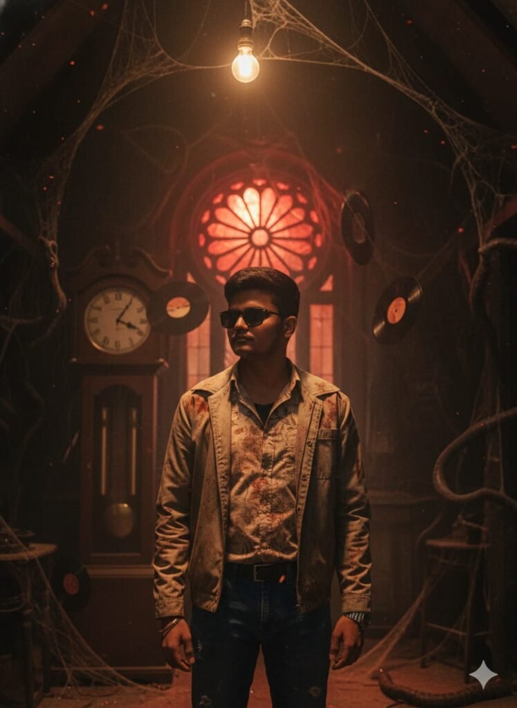 Produce a dark, atmospheric scene inside the Creel House from Season 4. The person in the reference photo is now standing in the attic with Vecna’s grandfather clock behind them. Preserve every single facial detail, hair, eye direction, and expression from the reference image with zero deviation. Light them dramatically with a single hanging bulb swinging slowly, casting deep shadows and warm orange highlights exactly like the show’s cinematography. Dress them in 1950s-meets-1980s clothing with subtle blood stains and dust. In the background, show the stained-glass rose window glowing red, spiderwebs, floating vinyl records, and Vecna’s tentacles creeping along the walls. Add the signature red-black Upside Down particles in the air. Use Arri Alexa-style digital look mixed with 1980s lens diffusion, strong chiaroscuro lighting, and the eerie silence vibe of the Creel House scenes.