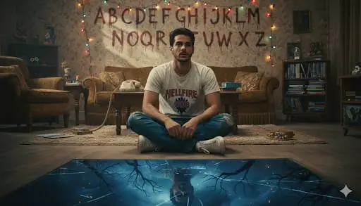 Create a cinematic poster.Show the same person from the reference - sitting con the floor inside a retro 1980s living room - wearing a white and black Hellfire Club t-shirt, blue jeans, white sneakers, the person's expression should be tense and distracted, as senses something unsettling nearby. Behind the person on the wall, include the iconic alphabet painted in a messy, horror-style handwriting, with colorful Christmas lights hanging above each letter. The lights should glow faintly, adding a chilling ambience to the room. In the foreground, at the bottom of the image, show a cracked reflective surface leading into a dark supernatural world - like a portal to the Upside Down - where a distorted shadowy reflection of thesame person appears, surrounded by fog, branches, and eerie blue-black tones.The environment must feel nostalgic and haunted: an old sofa, vintage decor, muted colors, soft film grain, dust particles, and low warm lighting in the living room contrasted with cold, ominous tones in the reflection. Cinematic depth, realistic textures, supernatural tension, no text or titles anywhere