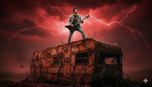 A photorealistic ultra wide shot of this person standing bravely on the roof of a rusted mobile home trailer. They are wearing a Hellfire Club t-shirt, a light blue denim jacket, and light blue denim jeans. They are holding a black Explorer electric guitar in a heroic stance. The environment is the Upside Down dimension: ominous red stormy sky, red lightning, dark clouds, floating ash particles, and creepingvines.