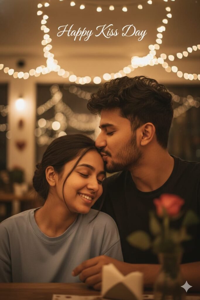 Background tastefully decorated with minimal roses, warm lights, romantic ambiance, optional elegant signage "Happy Kiss Day" subtly placed. Natural skin tones, realistic facial textures, DSLR 85mm portrait photography style, f/1.8 aperture, sharp focus on faces, creamy depth-of-field blur, realistic shadows, cinematic warm color grading, ultra-detailed textures,
