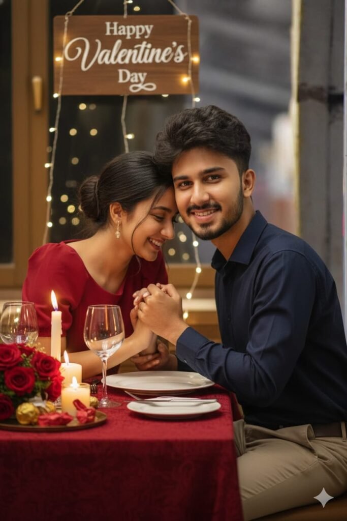 realistic shadows, cinematic warm color grading, ultra-detailed textures, 8K clarity, professional Instagram aesthetic, authentic couple lifestyle photography, romantic Valentine mood, photorealistic