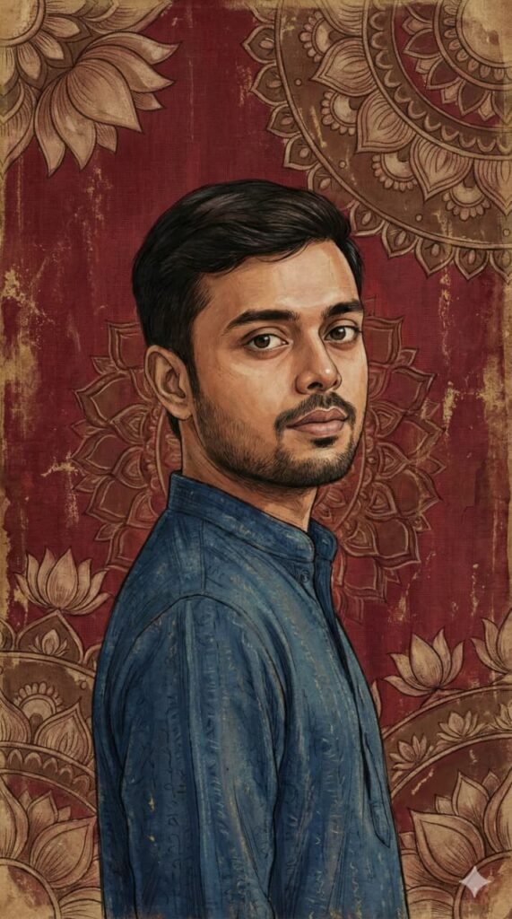 Vertical artistic portrait using the uploaded image as a hard identity lock. Preserve exact face: same facial structure, skin tone, eye shape, eyebrows, nose, lips, hairline, hair texture,beard/stubble if present. No beautification. No face change. Vertical frame 9:16. Medium close-up close-up. Subject turned slightly sideways, head gently rotated back toward the camera, over-the-shoulder feel. Eyes looking directly at the viewer with a calm, composed gaze. Expression neutral to soft. Natural masculine posture. Foreground subject sharply defined. Skin rendered in a painterly illustrated style, not photorealistic. Visible brush strokes, fine linework, soft texture. Maintain realistic facial planes adapted to a male face. Hair unchanged from the uploaded image, softly textured, natural fall. Clothing simple and traditional-toned, blending with the artwork (no modern logos). Background: deep maroon and crimson red, textile-inspired surface with intricate hand-drawn mandala and lotus motifs, Indian miniature / folk mural style. Aged parchment texture,