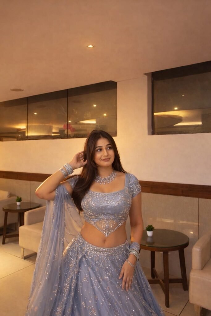 Using my uploaded photo as reference, change my outfit to the exact lavender-blue lehenga from the reference images. The lehenga has heavy silver sequin embroidery, a fitted short-sleeve blouse with a deep neckline, a flowing embellished skirt, and a sheer matching dupatta draped naturally over one shoulder. Keep my original face, body type, skin tone, and hair exactly the same with realistic proportions. Cinematic low indoor lighting, soft blue background, elegant Bollywood night scene vibe. High realism, sharp focus, natural skin texture, detailed fabric shine. No text, no watermark.