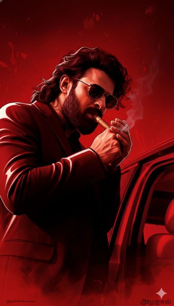 Create a cinematic digital illustration of the person in the reference photo. Maintain the exact face, identity, hairstyle, expression, skin tone, and pose with zero distortion. Transform the entire scene into a deep red high-contrast Tamil gangster movie poster style. Replace the background with red gradients, smoky atmosphere, and subtle textures. Add bold comic-book shading, thick outlines, strong black shadows, and glossy highlights on the skin and clothes. Stylize the outfit with richer tones, clean folds, and dynamic lighting while keeping the original clothing design. Add intense highlights to the jawline, cheekbones, and edges of the body. Maintain the original pose and attitude. Create a gritty, powerful, cinematic mood with dramatic lighting and high contrast.