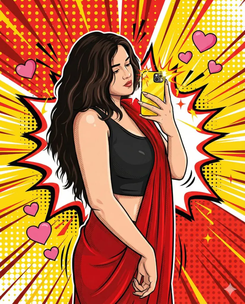 Transform the image into a high-end professional pop-art vector illustration. Use Clean vector shapes with accurate facial features, soft cartoon detailing, minimal halftone shading. Add comic bursts, dotted patterns, motion lines, energy effects, spark highlights using the photo's dominant colors. Bold outlines, crisp edges, vibrant balanced colors, fully color-adaptive pop-art background and some cute pink hearts!"